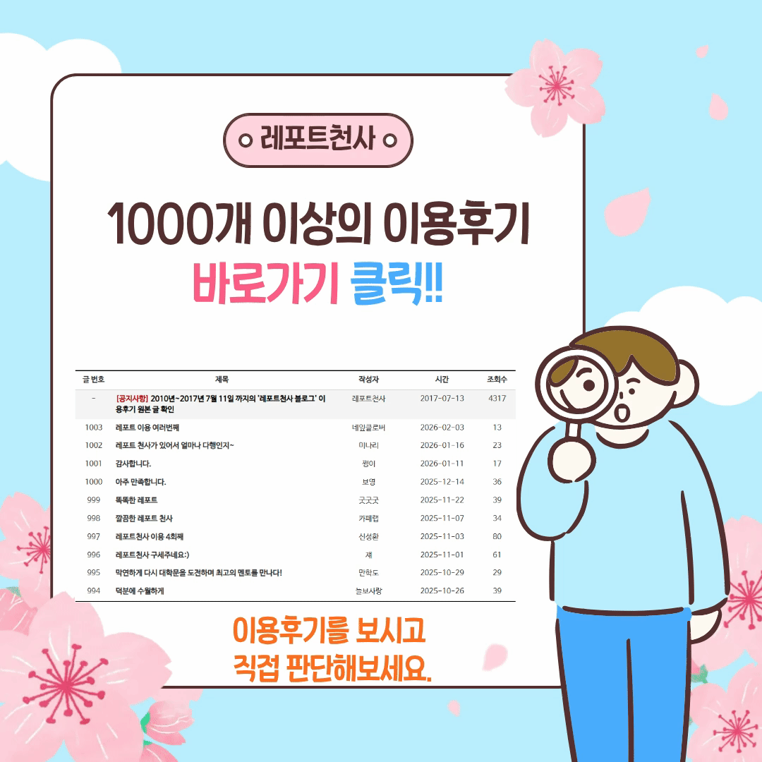 1,000개 이상의 이용후기는 많은 고객님들께서 직접 남겨주신 만족의 기록입니다!!