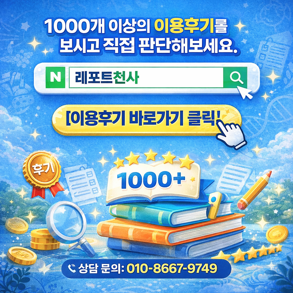특히 레포트천사는 2010년부터 운영되어 온 곳으로, 17년 동안 10만 건 이상의 작업 경험이 쌓여 있고 1000건이 넘는 이용 기록이 있다는 점이 인상적으로 느껴졌어요. 이런 부분은 선택 기준으로 충분히 참고할 만하다고 생각해요.
